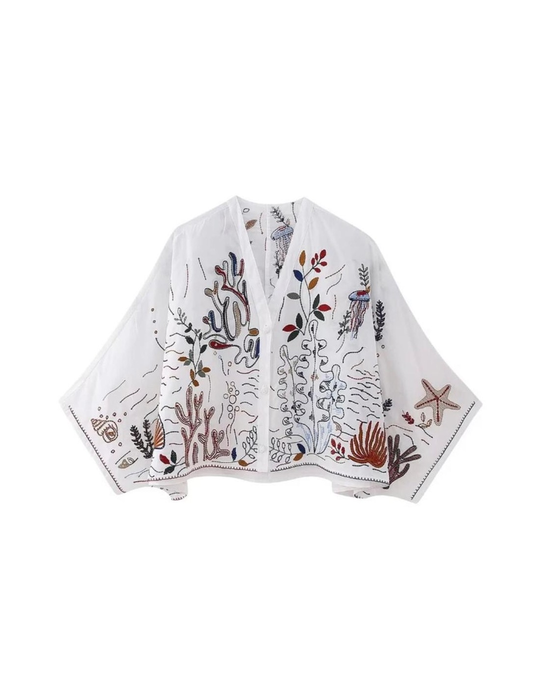 Blusa es de un blanco puro y cuenta con mangas largas, lo que le da un toque elegante y fresco. Su diseño destaca por un hermoso estampado de algas marinas, que incluye una variedad de colores que representan diferentes especies de algas y plantas marinas. Este estampado añade un aire tropical y veraniego a la prenda.