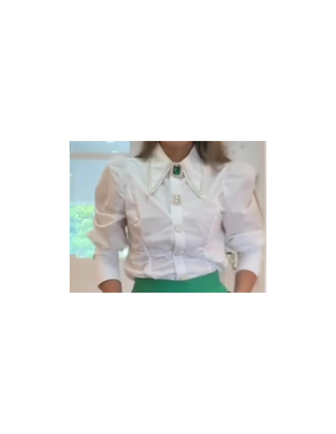Prenda clásica y versátil. El diseño típico incluye un corte recto o ligeramente ajustado al cuerpo, con un cuello tradicional de camisa. Los botones suelen estar dispuestos de manera central en la parte frontal, desde el cuello hasta el dobladillo, lo que permite usar la blusa tanto cerrada como ligeramente abierta para un look más relajado.