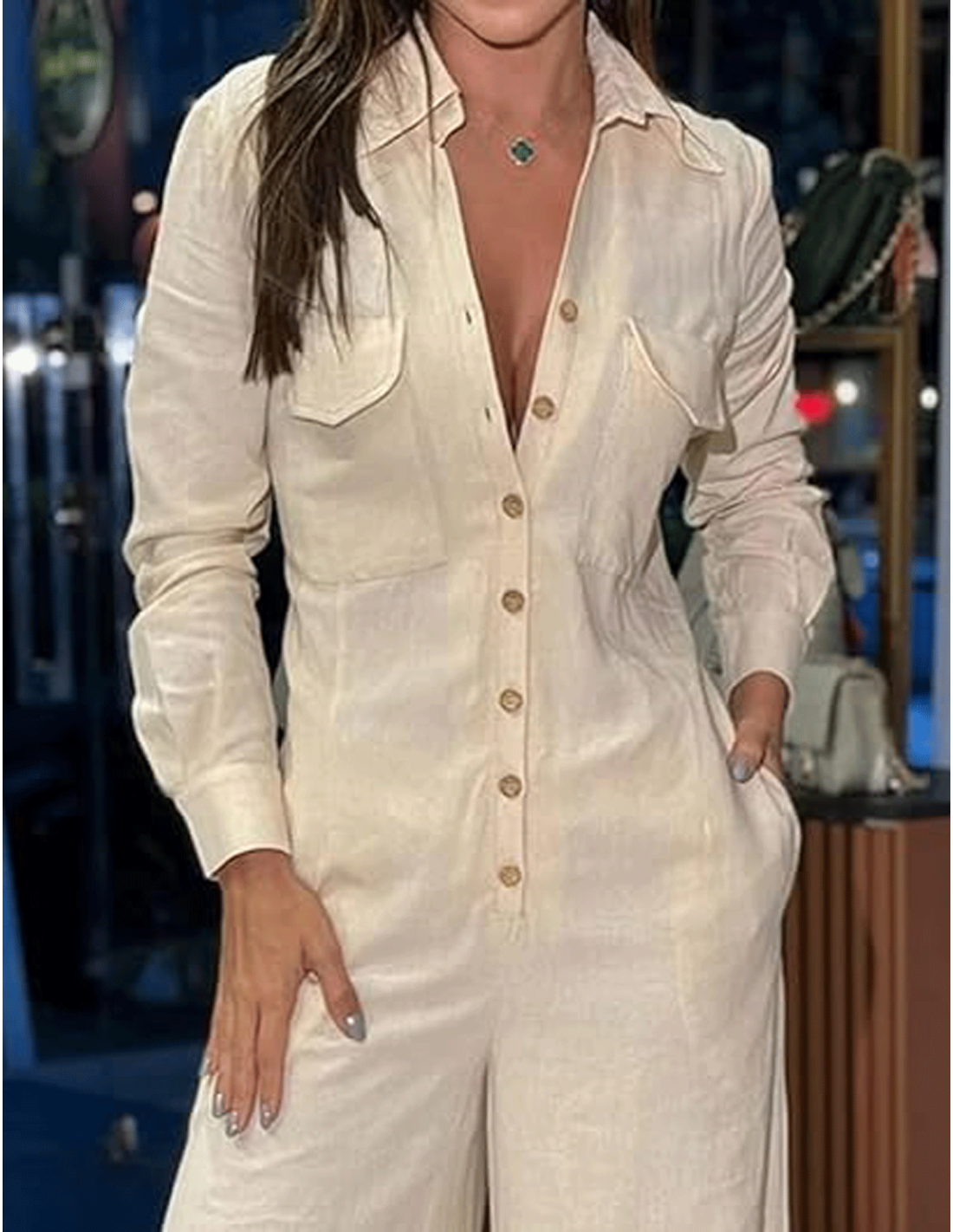 El enterizo crema tiene mangas largas y botones frontales. Ajustado en la cintura, ofrece una silueta favorecedora y es ideal para looks casuales o formales.