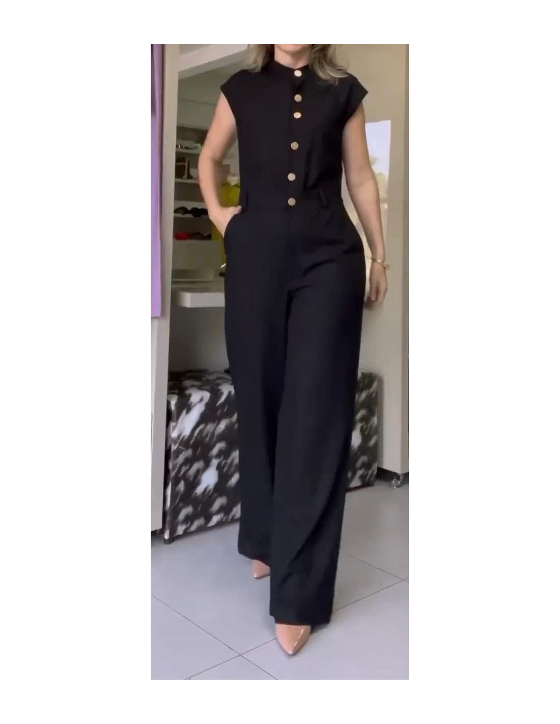 Enterizo liso sin mangas botonadura única, cintura alta, recto, de tubo, Enterizo de pierna ancha mangas cortas confeccionado íntegramente en Lino, suave al tacto, escote alto, detalles con botones en el frente. Modelo recto y suelto, largo , pliegues y con botones para cierre y bolsillos laterales, para realzar la silueta femenina y sumamente cómodo, tienes que tenerlo.