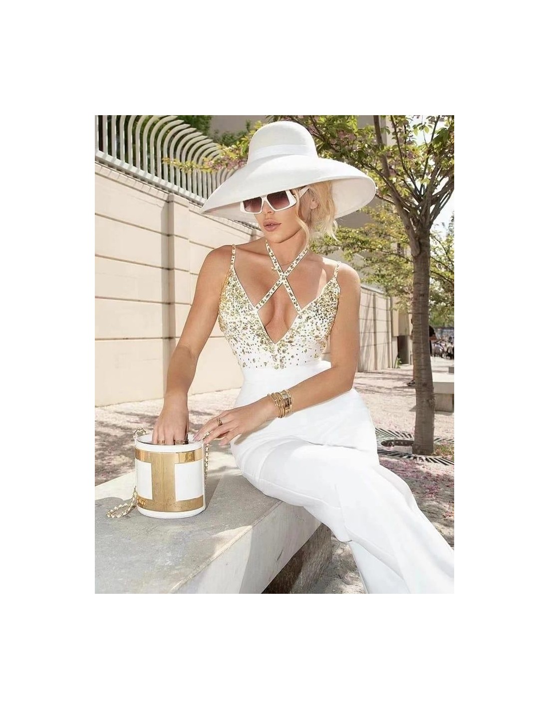 El top es de tiras con un escote en V profundo, adornado con detalles dorados brillantes que cruzan sobre el pecho. La parte inferior es un pantalón blanco de talle alto, de corte amplio, que aporta un aire de lujo y frescura. Complementando el outfit, lleva un sombrero blanco de ala ancha y gafas de sol, logrando un estilo glamuroso perfecto para eventos diurnos o ocasiones especiales al aire libre.