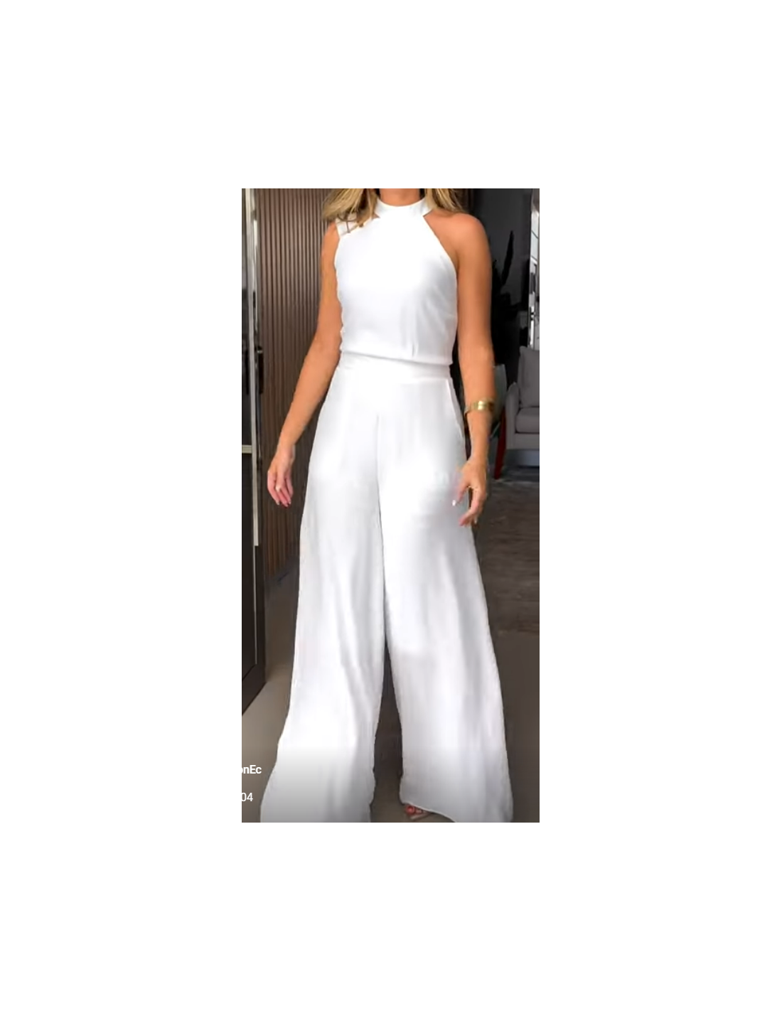 Este elegante enterizo blanco tiene un diseño sin mangas con un cuello alto y detalles de tiras en los hombros, que le añaden un toque moderno. La parte superior es ajustada, mientras que los pantalones son de corte amplio y fluido, lo que ofrece comodidad y un estilo sofisticado. Es una prenda perfecta para eventos formales o casuales, brindando un look fresco y contemporáneo.