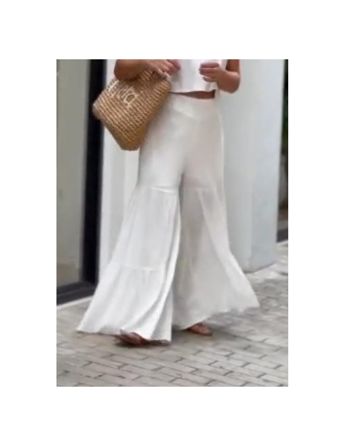 Pantalón blanco de licra estilo palazzo, con una silueta amplia y líneas en la parte de la cintura que aportan un toque moderno y elegante. Ideal para ocasiones casuales o semi-formales.