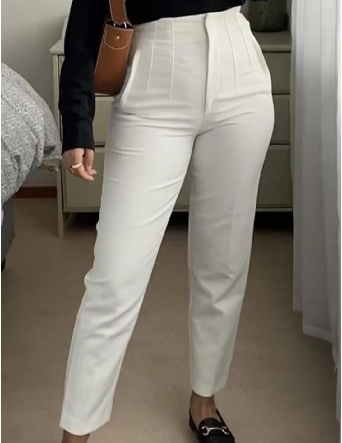 Pantalón blanco de licra estilo palazzo, con una silueta amplia y líneas en la parte de la cintura que aportan un toque moderno y elegante. Ideal para ocasiones casuales o semi-formales.
