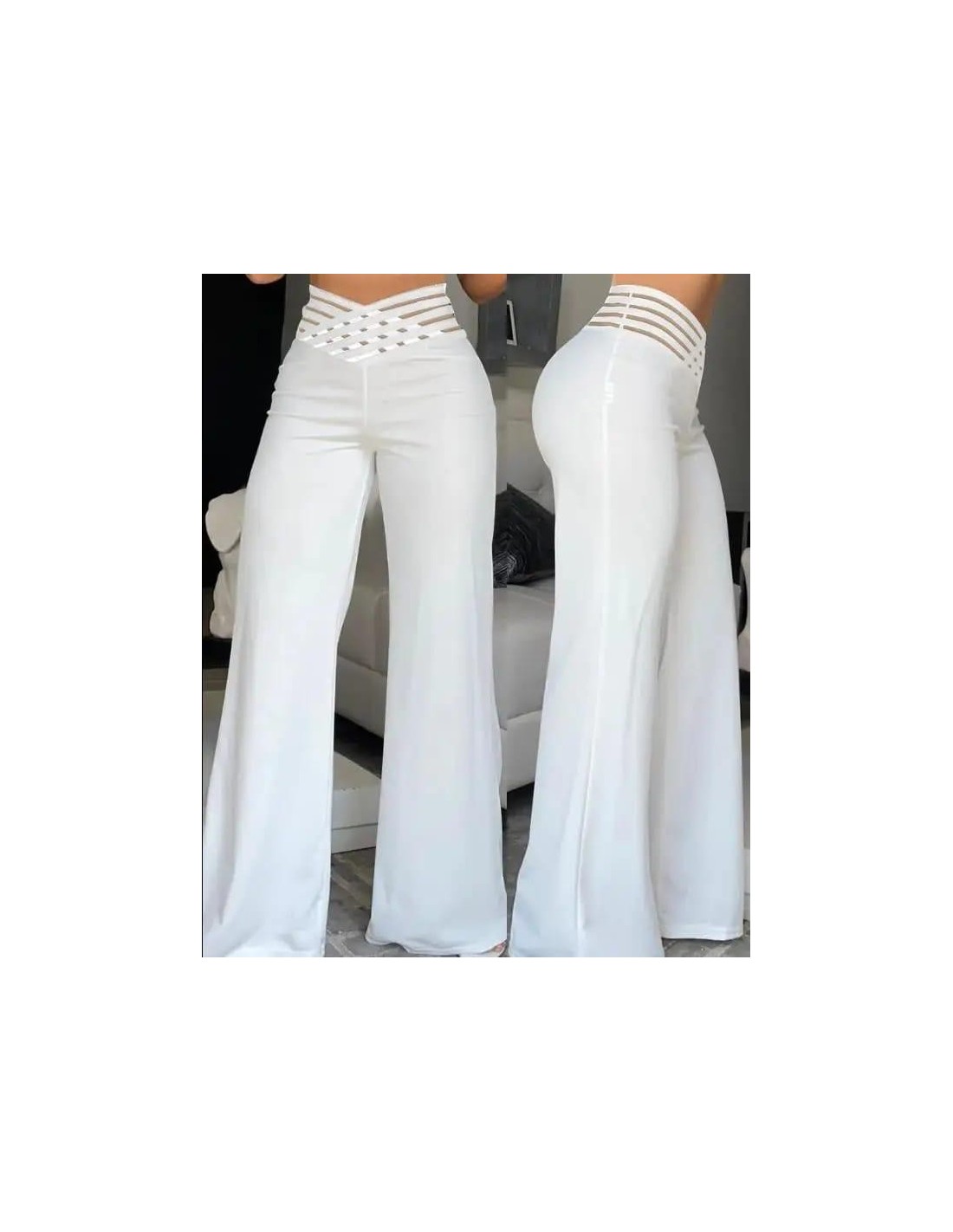 Pantalón blanco de licra estilo palazzo, con una silueta amplia y líneas en la parte de la cintura que aportan un toque moderno y elegante. Ideal para ocasiones casuales o semi-formales.