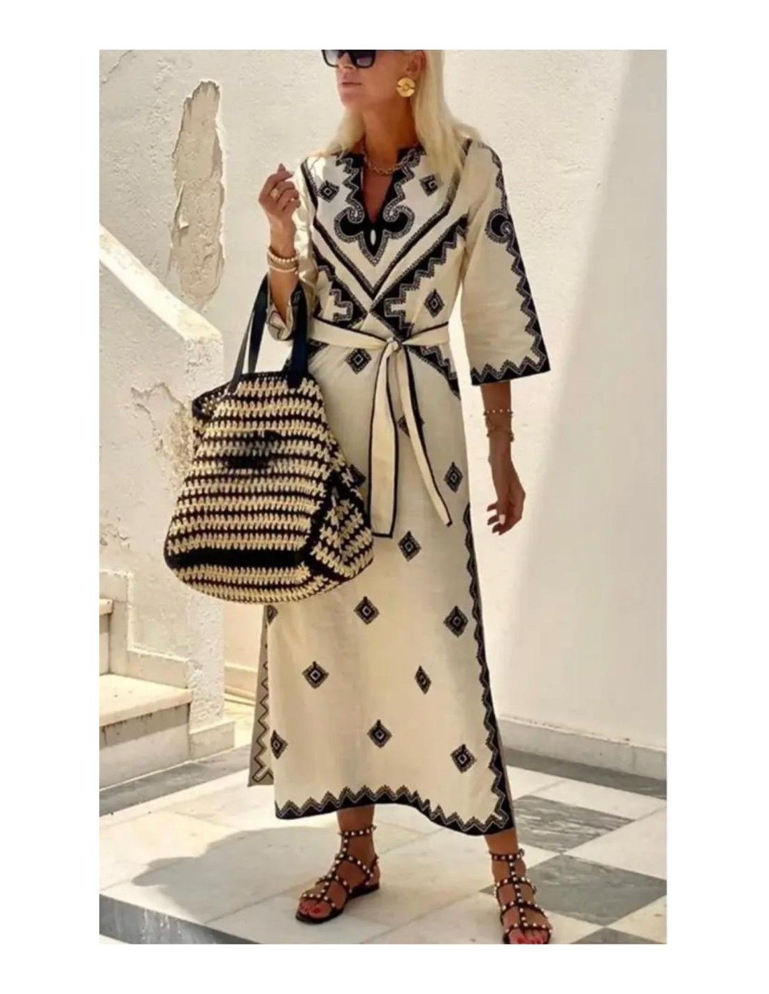 El vestido de fiesta con cinturón y cuello en V para mujer es una opción elegante y versátil, ideal para la oficina o eventos especiales en primavera y otoño. Su diseño largo con estampado retro le añade un aire sofisticado y único. La silueta en línea A favorece la figura, mientras que la abertura lateral añade un toque moderno y sensual. Con media manga, es perfecto para climas más frescos, y el cinturón en la cintura permite un ajuste cómodo y personalizado. Es una prenda ideal para quienes buscan estilo y comodidad en un solo look.