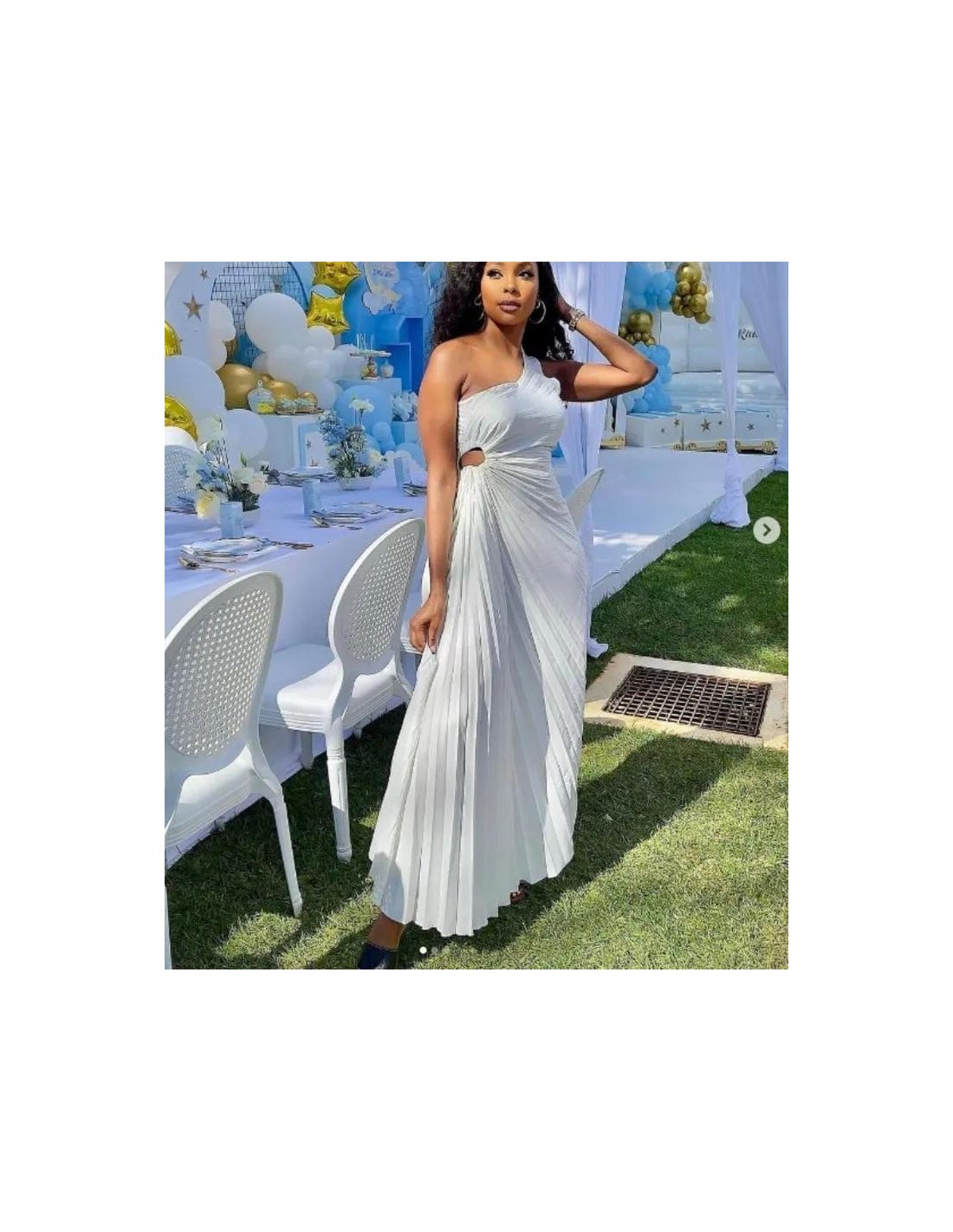 Prenda elegante y con un aire fresco. El tejido plizado crea una serie de pliegues verticales que aportan textura y movimiento al vestido, permitiendo que fluya de manera ligera. El color blanco le da un toque de pureza y sofisticación, lo que lo convierte en una opción ideal para eventos formales, bodas o días de verano.