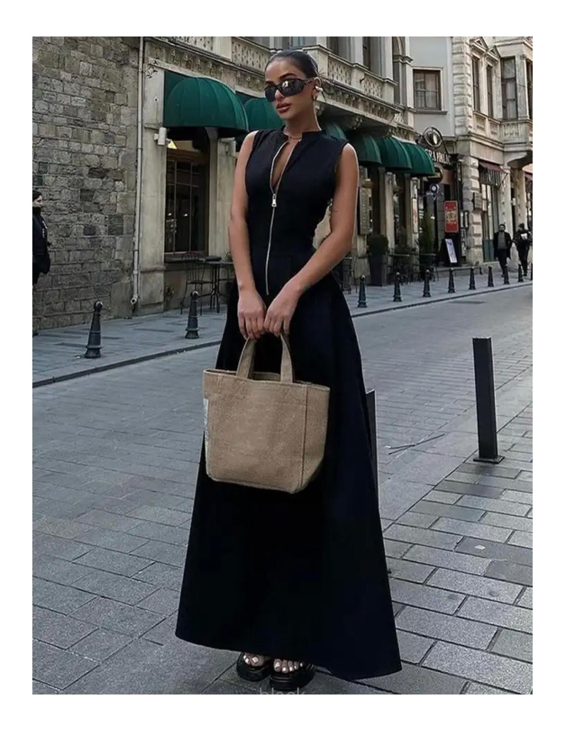Vestido negro largo sin mangas con cierre en el pecho. Elegante, moderno y versátil, ideal para eventos formales o salidas nocturnas.