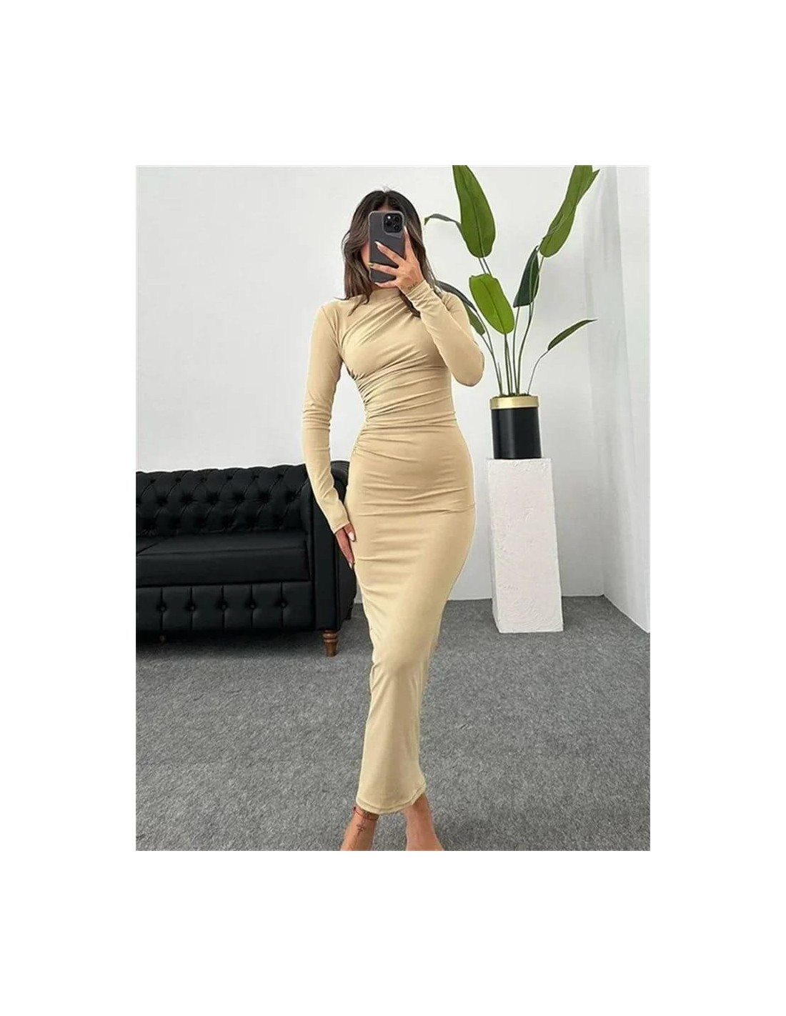 Vestido largo beige de licra con mangas largas es una prenda que se caracteriza por ser ajustada al cuerpo, resaltando la figura de manera elegante y sofisticada. El material de licra le otorga elasticidad, adaptándose cómodamente al contorno de quien lo lleve. Al ser de mangas largas, ofrece un estilo más cubierto, pero sin perder la sensualidad de un corte ajustado. Este tipo de vestido es ideal para ocasiones formales o eventos nocturnos, por su apariencia estilizada y sobria.