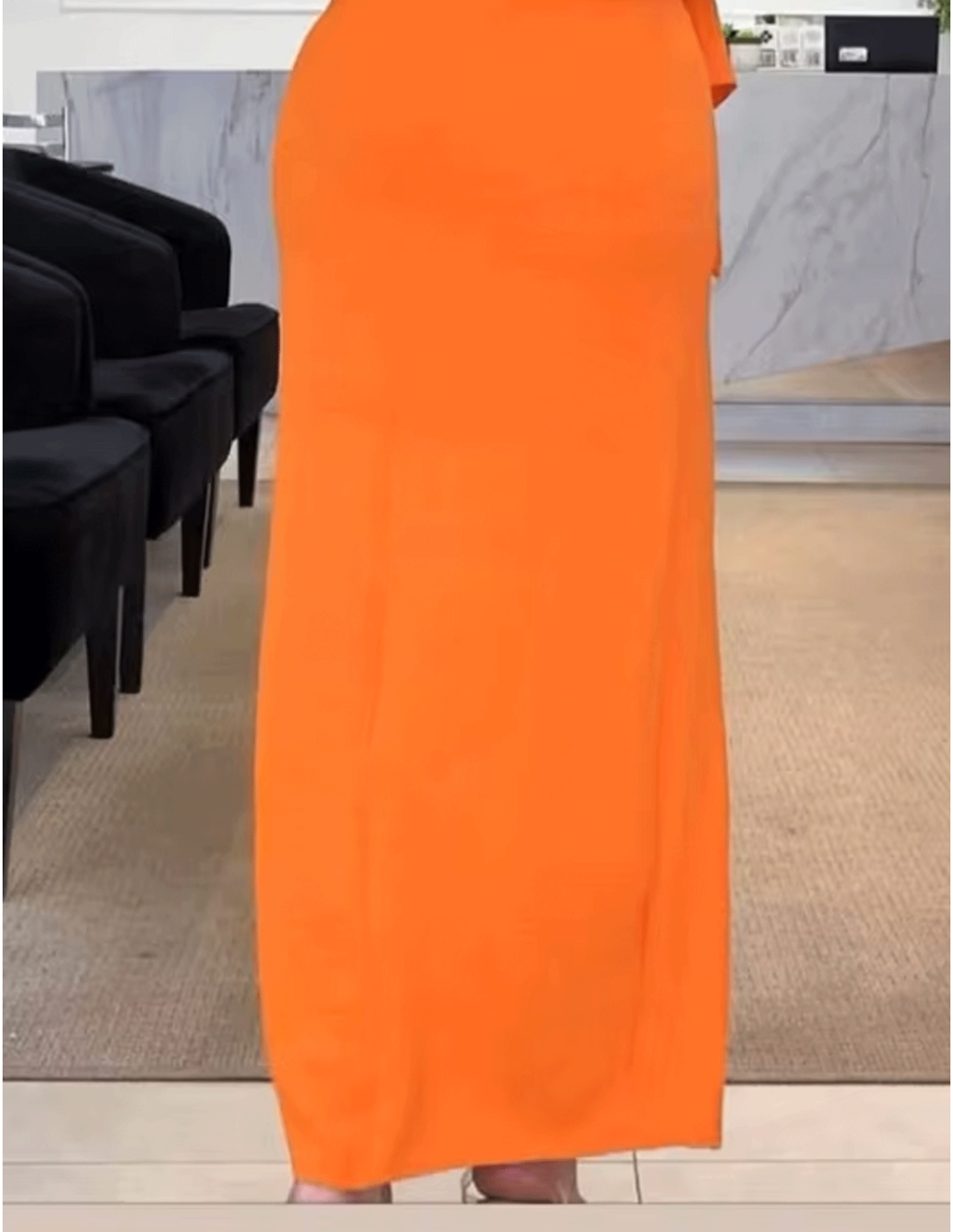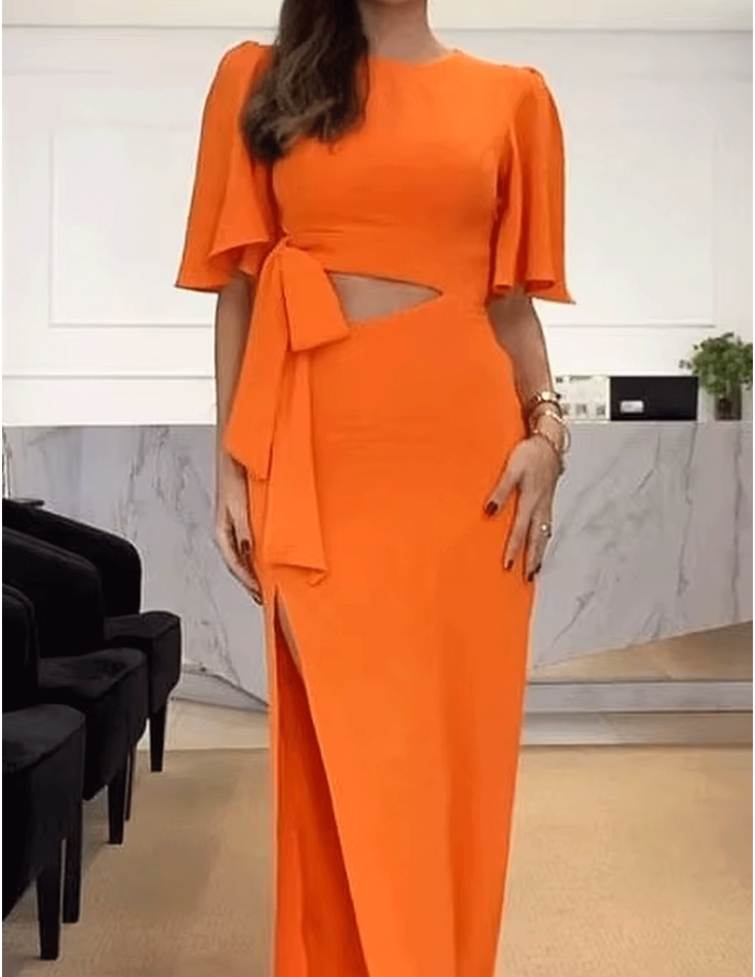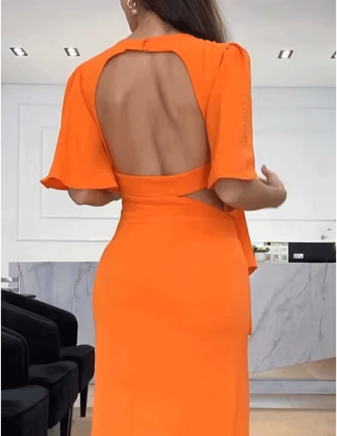 *Bajo pedido de 5 - 6 dias hábiles* vestido naranja, con la espalda descubierta en un corte ovalado, mangas cortas sueltas y ajustado en la cintura.