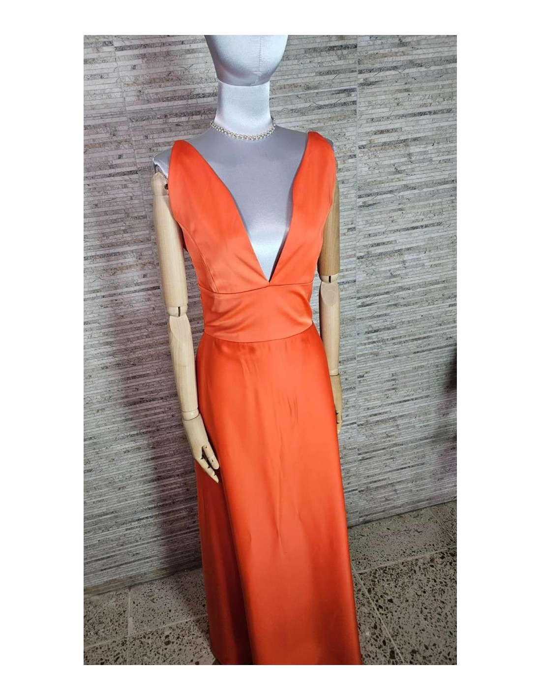 Vestido largo con escote en V de seda satin apropiado para eventos nocturnos o semi formales.