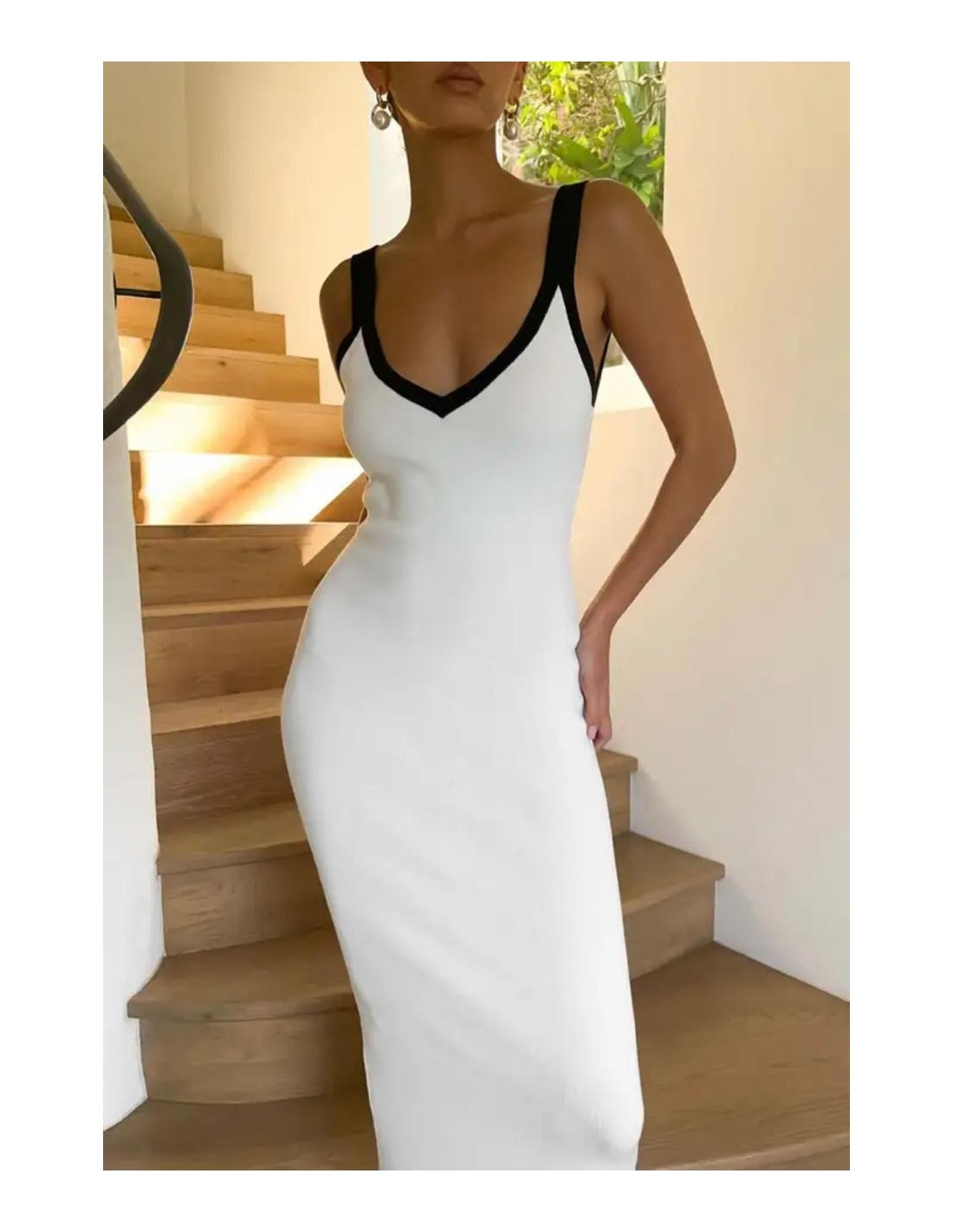 Vestido BLANCO largo de punto con tirantes negros para mujer, prenda sin mangas, cuello en V