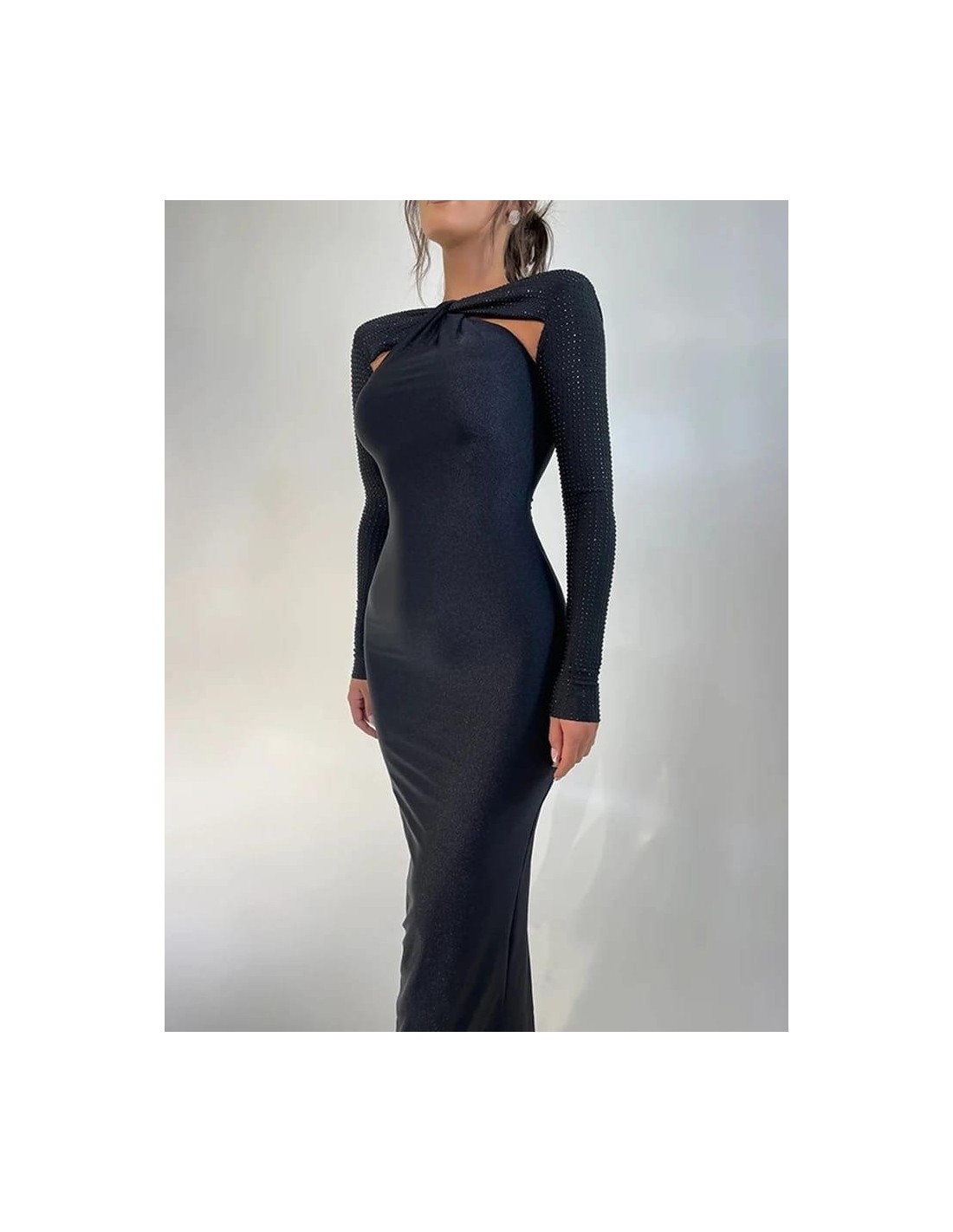 El vestido negro de licra está diseñado para ajustarse al cuerpo, resaltando las curvas de manera elegante. Cuenta con mangas largas que añaden un toque de sofisticación y cobertura. La tela tiene un acabado brillante con puntos brillantes que aportan un efecto llamativo y festivo, ideal para ocasiones especiales o salidas nocturnas. Su combinación de comodidad y estilo lo convierte en una opción versátil para quienes buscan un look impactante.