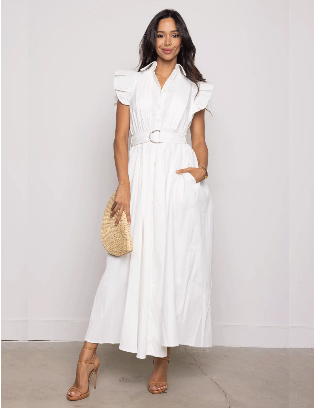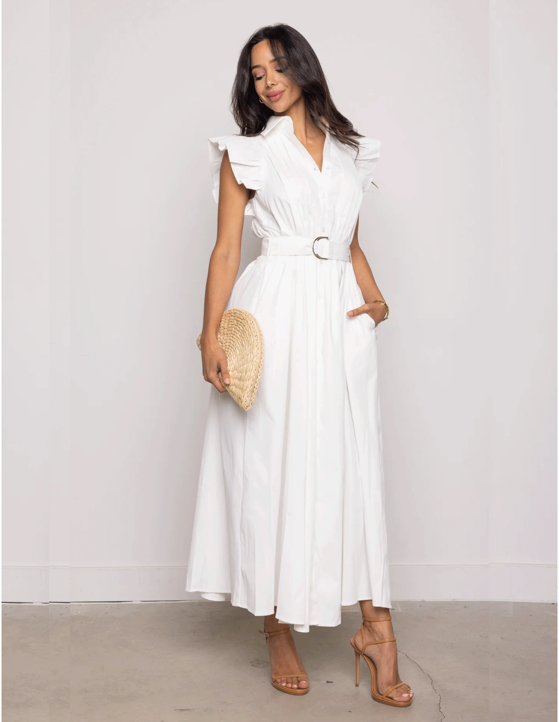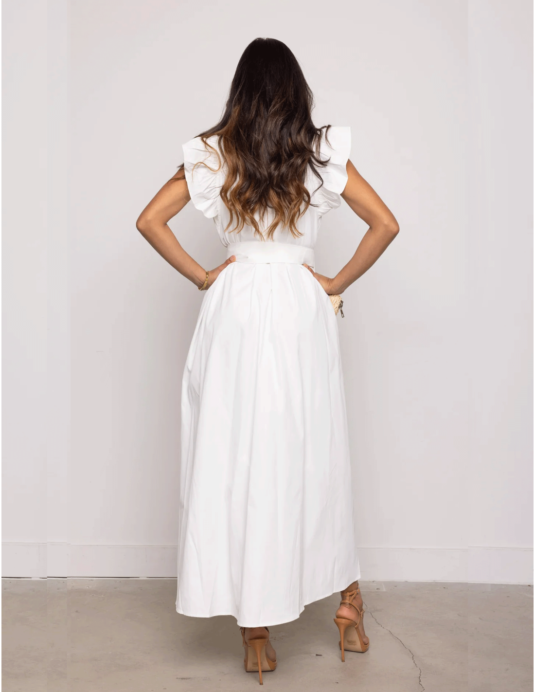 El vestido en la imagen es largo, de un tono blanco, con un diseño fresco y elegante. Tiene un escote en V pronunciado y detalles de volantes en los hombros, que añaden volumen y un toque femenino. La cintura está definida con un cinturón del mismo tejido que el vestido, lo que realza la figura. El tejido parece ligero, ideal para climas cálidos o eventos al aire libre. El look se complementa perfectamente con un pequeño bolso de mano, lo que le da un aire sofisticado y moderno.