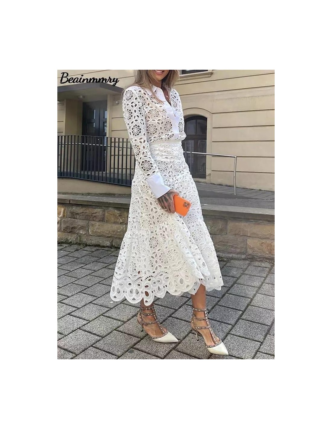 Camisa de cuello solapa y manga larga acabada en puño. Detalle de bordados perforados. Bajo asimétrico. Cierre frontal con botones. Midi elegante de cintura alta.